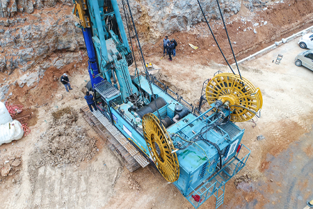 欧感液压潜孔锤被业内人士称之为大口径硬岩终结者,可应对200兆帕以内的所有岩层,该款设备是我公司针对目前桩基施工领域硬岩难打、施工成本高、钻进效率低的难题所研制的一款专门解决硬岩成孔的设备。该设备需配合旋挖钻机施工,是将液压振动锤变形后联接在旋挖钻机钻杆下端,液压振动锤下端联接特制的简钻。工作时,先用旋挖钻机将所要成孔的上部覆盖层清除,再将液压高频振动潜孔钻下致孔底岩面,启动泵站,在旋挖钻机带动实现360°连打带钻。该款潜孔锤具有成孔效率高、施工成本低、施工方便、无损快速换装、低噪音、无粉尘、全护筒跟进等特点,目前已在众多项目中有成功应用。